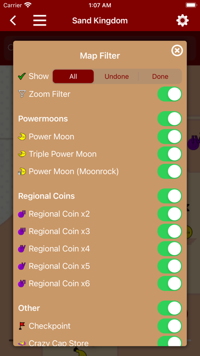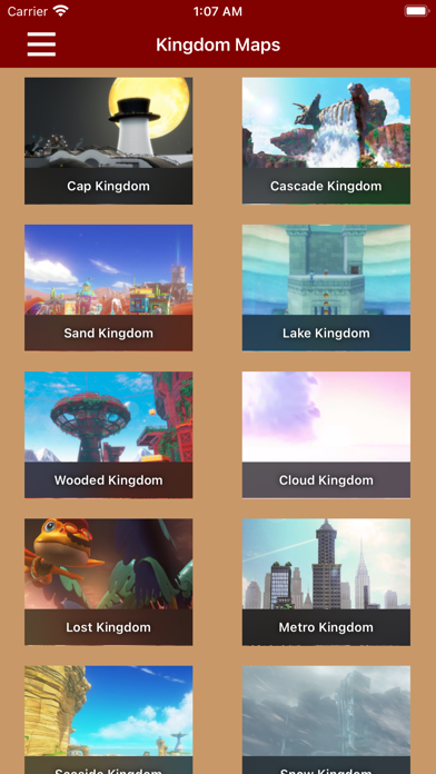 Unofficial offline maps for Super Mario Odyssey. The companion features: - Kingdom maps - Map positions of: - Power Moons - Regional (Purple) Coins - Checkpoints - Crazy Cap Stores - Paintings - Moon Rocks - Talkatoo - Hint Art - Minigames - Luigi - Checklists for your collected Power Moons, Purple Coins, Crazy Cap Store items, Cappy Captures, Music Tracks and amiibos - List of game compatible amiibos - List of all costumes - List of all enemies - List of all Crazy Cap Store items - List of all Cappy captures - List of all Music Tracks - List of easter eggs and secrets - Stats page for detailed kingdom progress - Boss Guides - iCloud Sync - 3D touch shortcuts from app icon - Progress widget - Share functionality to get free IAPs